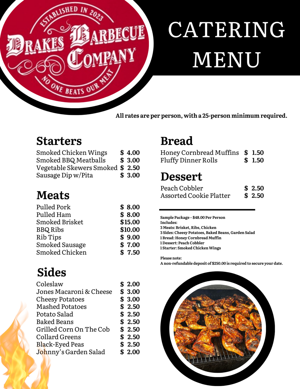 Drakes Barbecue Company, we don’t just serve food—we serve up mouthwatering experiences. From tender smoked brisket to fall-off-the-bone ribs, our menu is packed with BBQ favorites that’ll have your guests coming back for seconds (and thirds). Whether you’re planning a wedding, corporate event, or private party, we’ve got the flavors to make it unforgettable.